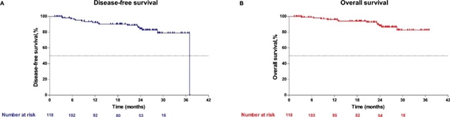 生存获益:1 年 DFS 92.42%、2 年 DFS 84.61%,中位 DFS 36.99 个月;1 年 OS 96.19%、2 年 OS 88.22%,中位 OS 未达到。