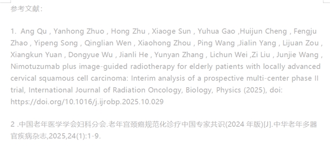 由中国老年医学学会妇科分会制定的《老年宫颈癌规范化治疗共识(2024年版)》,已推荐对于确诊ⅠB3、ⅡA2 ~ Ⅳa 期的局部晚期老年宫颈癌患者,如存在顺铂禁忌证或不耐受,可更换为卡铂;如患者病理类型为鳞癌,尼妥珠单抗也作为可选方案。这项研究的发表进一步证实了对于无法耐受化疗的老年局部晚期宫颈癌患者,尼妥珠单抗联合影像引导放疗,兼顾疗效与安全性,有望成为新的临床选择。