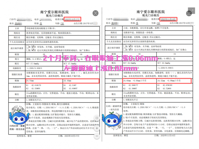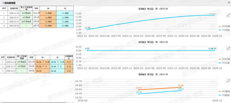 两年零八个月后,2025年10月,7岁的小郭再次踏入诊室,情况已急转直下:远视储备不仅耗尽,更转化为双眼125度的近视。更关键的是,他的眼轴——决定近视本质的生理指标——大幅增长!2年4个月的时间里,右眼增长1.33毫米,左眼增长1.31毫米。这意味着眼球已被拉长,像吹大的气球,视网膜等组织承受着被拉伸变薄的风险,为日后高度近视及可能并发眼底病变埋下了生理伏笔。家长回忆,其实一年前学校体检视力已不足5.0,但孩子一句“看得清黑板”,便让问题被搁置,直至在后排看黑板开始模糊。