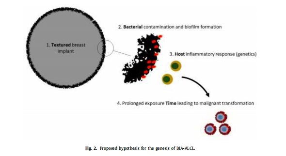 主流假说提出“细菌微生物组理论”,即毛面假体表面易滋生细菌形成微生物组,引发慢性炎症,进而导致T细胞活化转化为淋巴瘤。更具体地说,BIA-ALCL的发生是“毛面假体-生物膜-慢性炎症-遗传易感”多环节协同作用的结果。