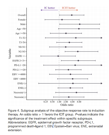 ICIT 方案的优越性在大多数预设亚组中保持一致,ICIT 方案的获益在男性患者(OR, 5.78% 95% CI, 1.3-54.75; P=0.02)、晚期淋巴结疾病患者(N2-N3;OR, 7.02% 95% CI, 1.86-57.21; P=0.02)以及 EGFR 高表达患者(2+/3+;OR, 7.38; 95% CI, 1.25-43.56; P=0.03)中尤为显著。