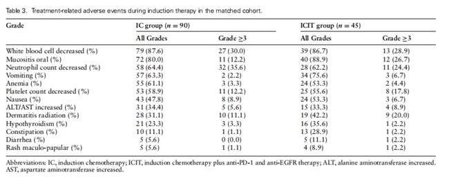 非血液学毒性中,ICIT组3级以上口腔黏膜炎(26.7% vs 12.2%)和肝毒性(8.9% vs 5.6%)略有升高,但均在临床可管理范围内;